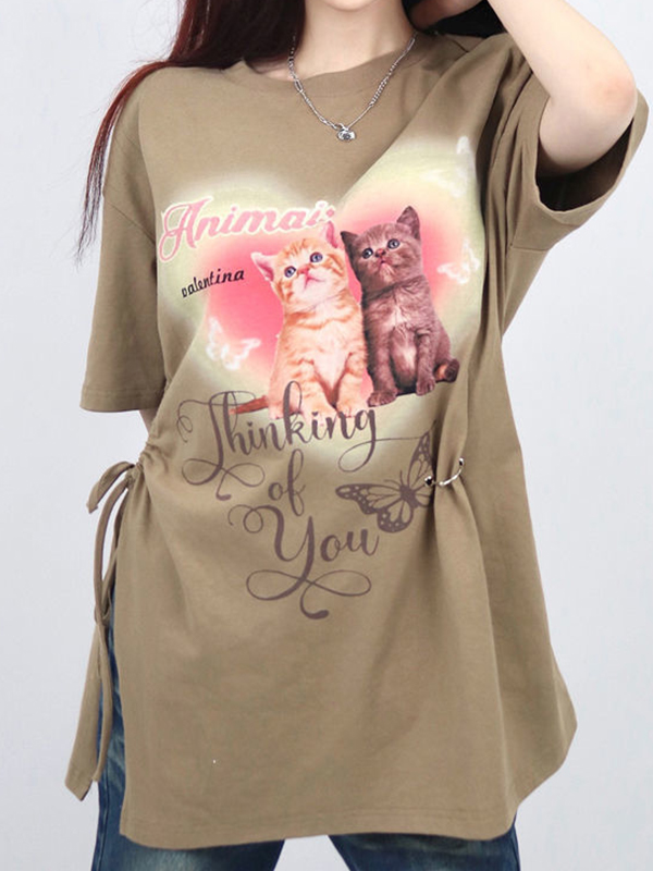 Camiseta de manga corta extragrande con cordón y estampado de gato