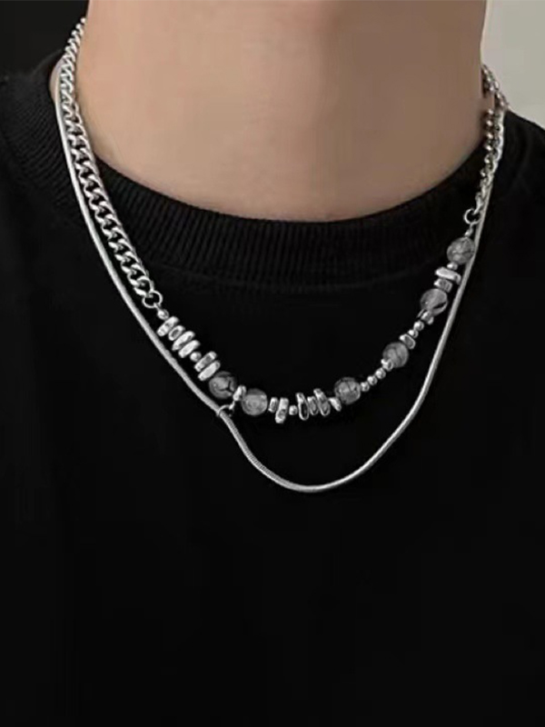 Collar de hueso de serpiente de plata rota con cuentas de piedra para hombre