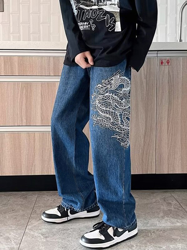 Jeans de pierna recta con bordado de dragón para hombre