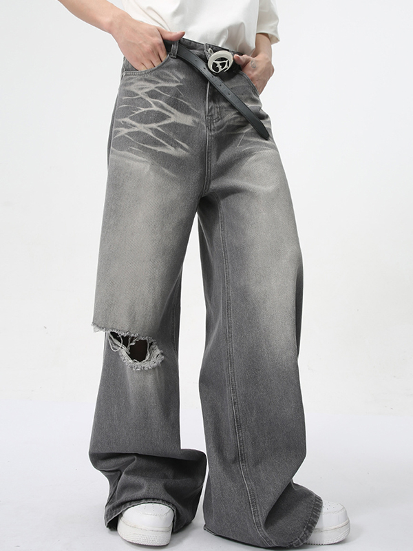 Jeans holgados con agujeros y estampado vintage lavado