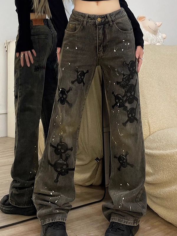Vaqueros boyfriend de cuero con bordado de calavera salpicada de tinta