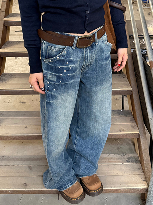 Vaqueros boyfriend con remaches retro americanos lavados con rayo