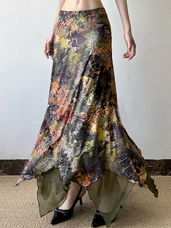 Falda larga con estampado de cuadros retro y patchwork en contraste de colores