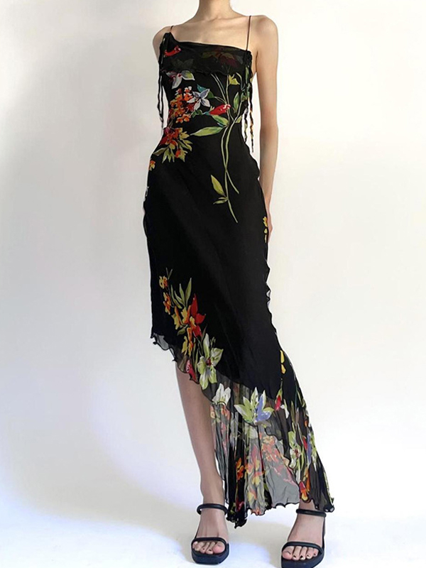 Vestido largo de malla plisada irregular con flores