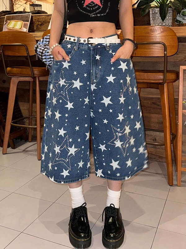 Shorts vaqueros con diamantes de imitación y estrella de cinco puntas estilo retro americano