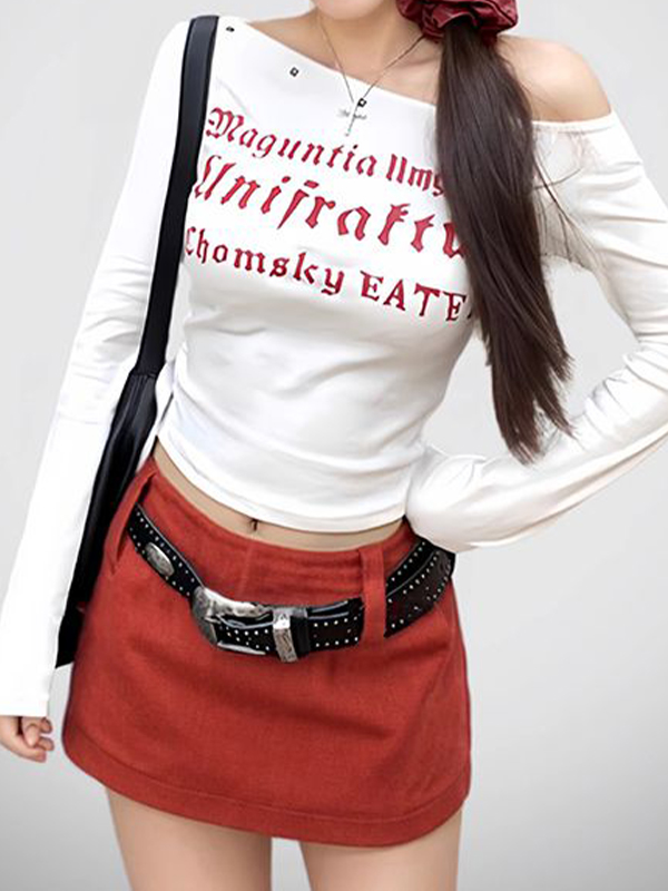 Camiseta de manga larga con letras y un hombro al descubierto