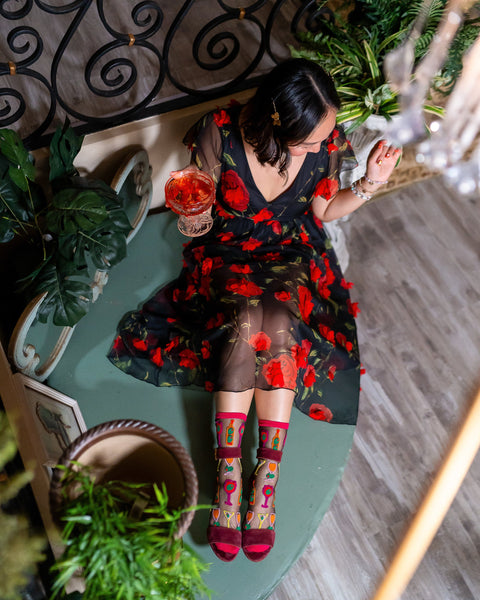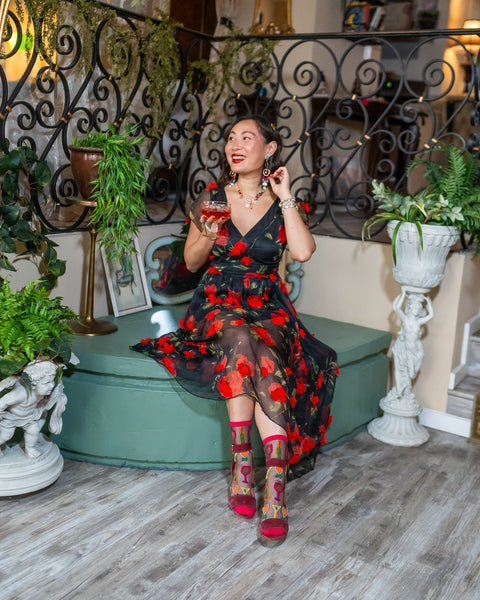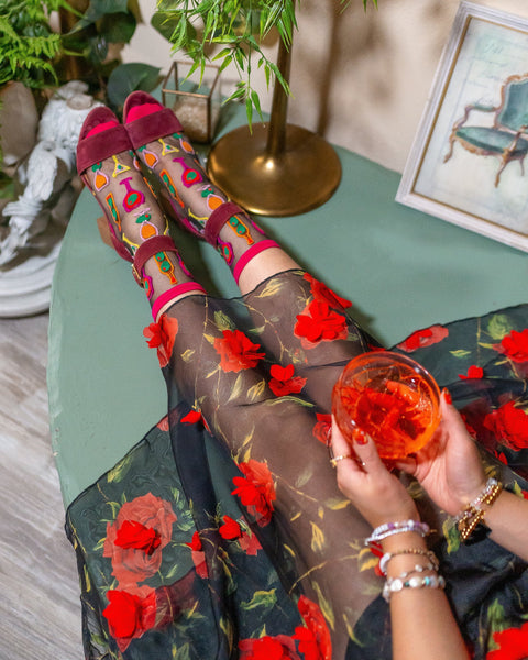 Notre chaussette transparente noire « Cocktail Hour » arbore des verres à vin, des martinis et des bouteilles de vin, rehaussés d’une touche olive inattendue. Son imprimé graphique et ses couleurs vibrantes lui confèrent un style digne d’un musée d’art, idéal pour des soirées peinture et dégustation entre copines. Des finitions couleur mûre au niveau du bord, du talon et de la pointe apportent une touche sensuelle. Taille unique. Convient aux pointures 36 à 41 (pointures américaines 5,5 à 10). 200 aiguilles. Un style à la fois original et élégant, sans motifs enfantins ni ridicules. Qualité supérieure, confection durable et extensible pour un confort optimal. Unique : l’accessoire parfait pour affirmer votre personnalité à travers vos tenues.