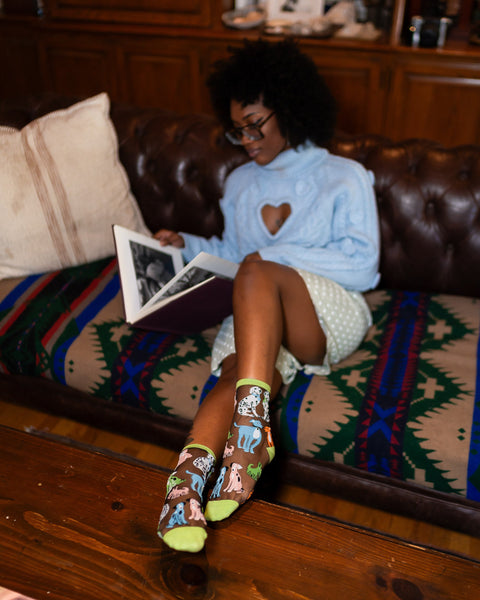 Nos chaussettes noires transparentes Dopamine Dogs sont votre source idéale de bonheur au quotidien. Pleines de personnalité, des adorables chiots colorés et originaux, verts, oranges, roses et blancs, ornent ces chaussettes, rendant chaque pas plus amusant. Le bord, le talon et la pointe vert frais ajoutent une touche printanière et ludique, tandis que le tissu noir transparent assure une allure chic et décontractée.