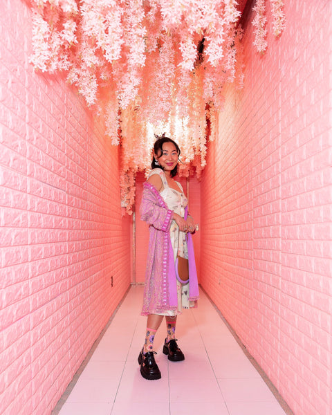 Des tournesols roses et violets font de cette chaussette fleurie à papillons l’essence même du printemps. Tandis que de fantaisistes papillons s’élèvent le long du pied, certains s’épanouissent en tournesols pour une touche ludique. Le tissu transparent couleur chair apporte une note douce et féminine.