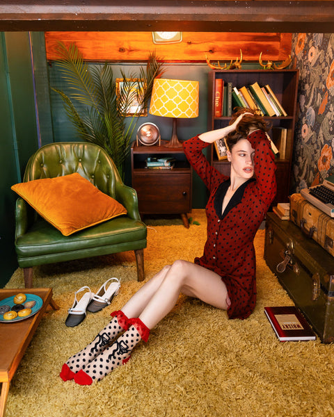 Notre chaussette transparente à pois et nœud papillon n’est pas une chaussette à pois ordinaire. Nous y avons ajouté une touche Sock Candy avec un nœud papillon surdimensionné inattendu et un revers à volant rouge, tout en conservant les couleurs classiques noir et rouge. Cette chaussette apporte une touche glamour hollywoodienne et coquette à votre garde-robe. Taille unique. Convient aux pointures femme américaines 5,5 à 9. 200 aiguilles. Originale et élégante à la fois, sans motifs enfantins. Qualité supérieure, confectionnée pour durer et dotée d’une élasticité confortable. Unique, l’accessoire parfait pour affirmer votre personnalité.