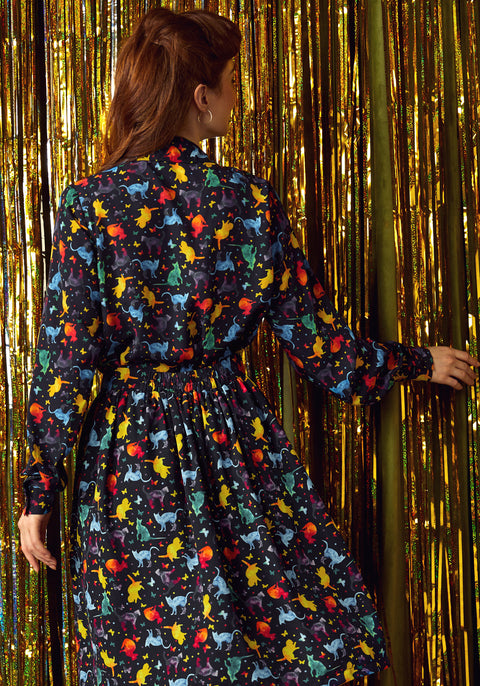 Envolez-vous vers un univers félin fabuleux avec la chemise boutonnée « All About Me » de notre marque ModCloth. Cette adorable chemise cosmique met en scène une constellation de chats colorés gambadant sur un fond noir nuit – car l’espace est plus beau avec des moustaches ! Légère et d’une fluidité parfaite, elle est dotée d’un col classique, d’une fermeture boutonnée et de manches longues, ce qui la rend idéale à superposer ou à porter seule. Associez-la à un jean pour un look décontracté au quotidien ou rentrez-la dans une jupe pour une allure hors du commun.