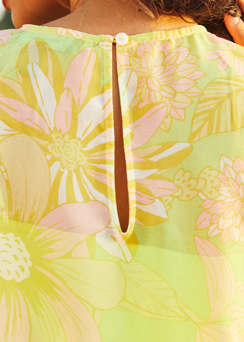 Avec son encolure ras du cou, son ouverture en forme de goutte avec fermeture à bouton et boucle au dos, ses manches papillon fluides arrivant aux coudes, son débardeur amovible vert citron intégré pour plus de couvrance et sa coupe carrée, ce haut au style rétro-chic décontracté est parfait pour un été stylé.