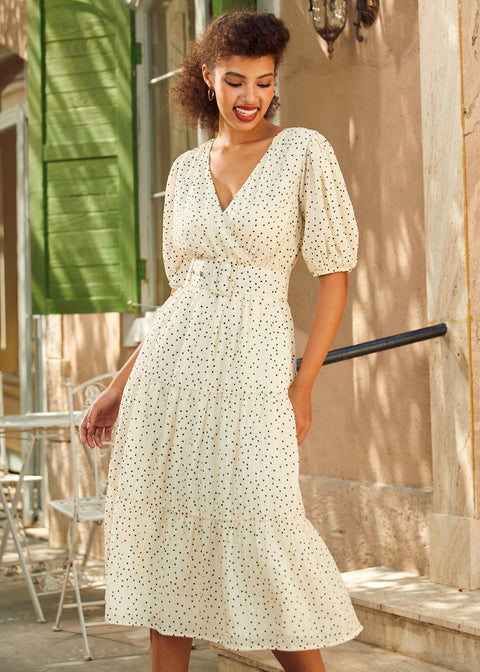 Grâce, nostalgique et d’un romantisme naturel — La robe Lillian Pearl est un bijou de la marque ModCloth, inspirée par le glamour discret des années 1930. Avec son décolleté cache-cœur, ses manches bouffantes volumineuses et sa jupe midi à volants qui flotte au gré de vos mouvements, cette robe donne vie à des rêveries vintage. Que vous sirotiez un thé sur la véranda ou que vous tournoyiez sous une guirlande lumineuse, son drapé souple et sa silhouette intemporelle en font une pièce précieuse à chérir pour toujours.