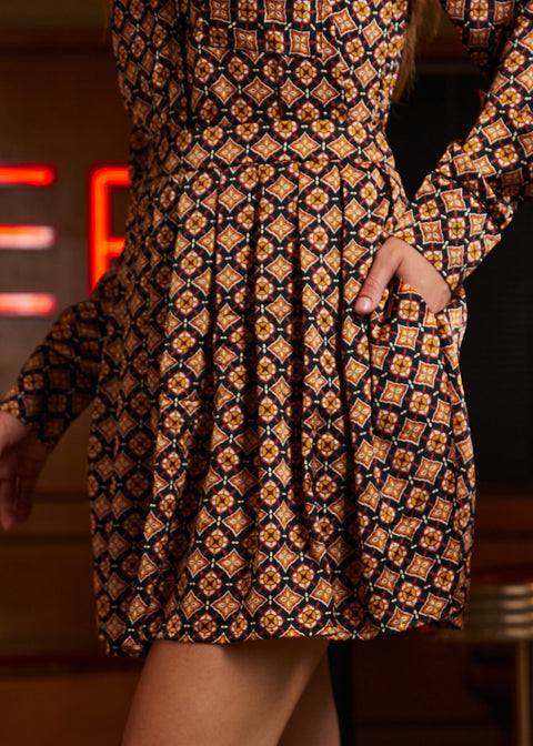 Découvrez la mini-jupe plissée Geo de notre collection ModCloth, une pièce fantaisiste et élégante. Cette jupe est un véritable bijou, ornée d’un motif géométrique captivant d’un or éclatant qui promet de transformer les journées ordinaires en occasions spéciales. Ses plis creux, confectionnés avec soin, offrent à la fois forme et fantaisie, assurant une silhouette raffinée qui se marie parfaitement avec des cols roulés douillets ou des hauts festifs. Idéale pour les soirées glamour comme pour les dîners élégants, cette jupe vous garantit de briller sous les projecteurs.