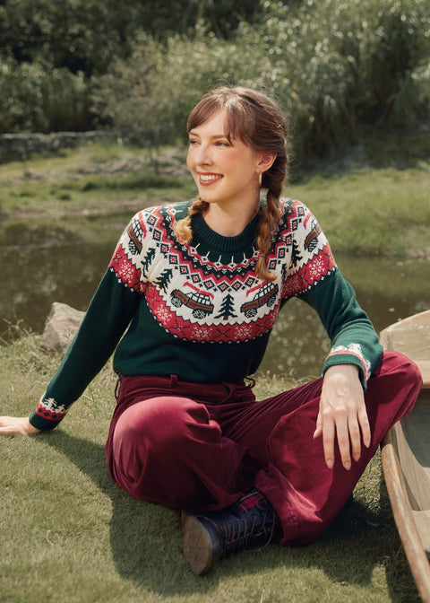 Laissez-vous transporter par l’esprit des road trips d’antan avec le pull raglan Golden Days de notre marque ModCloth. Ce modèle festif en maille arbore une base vert forêt ornée de charmants motifs Fair Isle : sapins enneigés, chariots en bois vintage et chalets douillets aux tons crème et rouge. Version moderne d’un pull de Noël classique, il est doux, gai et parfait pour les soirées au coin du feu comme pour les promenades hivernales. À porter avec du velours côtelé, du denim ou votre tasse de chocolat chaud préférée pour un look de héros instantané.