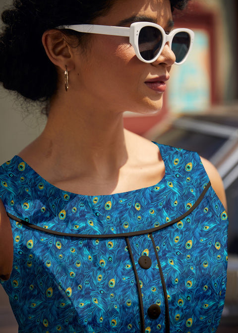 À la recherche d’une robe classique de style vintage Notre modèle Elizabeth, avec tous ses détails, a tout pour vous plaire et bien plus encore ! Présentée ici dans notre imprimé Paon, cette robe en coton est ornée de passepoils sur le corsage, de boutons décoratifs sur le devant, d’une taille cintrée avec des plis flatteurs, d’une jupe ample d’inspiration vintage avec des poches latérales invisibles et d’une fermeture éclair au dos.