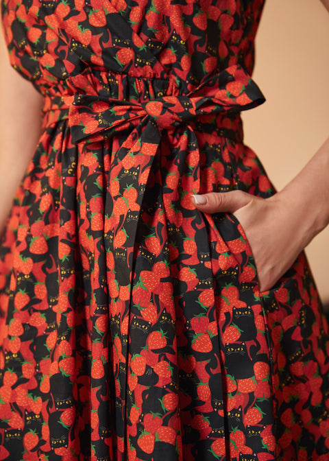 À la fois douce et légèrement décalée (exactement comme on l’aime), cette robe portefeuille effet « Énergie Instantanée » offre un charme pin-up vintage avec une touche espiègle. Des fraises juteuses se mêlent à un fond sombre, tandis que de furtifs chats noirs rôdent entre les fruits, donnant à cet imprimé un côté malicieux qui se révèle au premier abord. La coupe portefeuille flatte le décolleté en V et affine la taille, tandis que la jupe ample et évasée invite à un ou deux tours sur soi-même. C’est le genre de robe qui semble classique au premier regard, puis délicieusement surprenante une fois qu’on aperçoit les chats. Parfait pour les soirées en amoureux, les dîners entre amis ou pour faire un peu de bêtises inoffensives où que vous alliez.