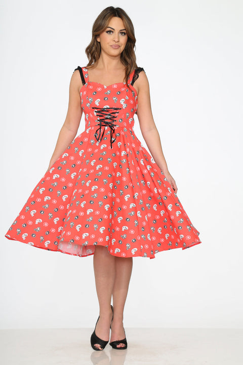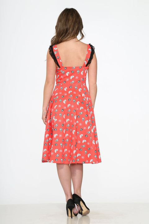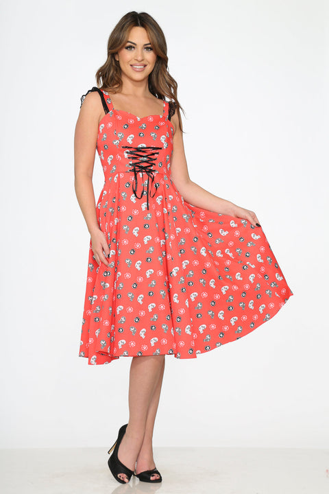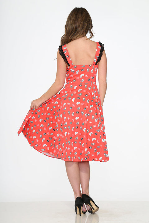 À la fois douce et mystérieuse, cette robe trapèze d’inspiration vintage signée Orchid Bloom est un véritable concentré de charme audacieux. Sur un fond rouge carmin parsemé de têtes de mort espiègles, cette pièce remarquable présente un laçage façon corset au niveau du buste et de ravissantes bretelles à volants pour une touche théâtrale.