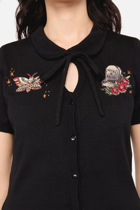 C’est comme une boutique vintage hantée, mais dans le bon sens du terme. Ce cardigan inspiré d’Halloween présente des broderies orange rétro sur une maille noire douce, alliant charme mystérieux et confort douillet. Parfait pour ajouter une touche de glamour gothique à votre look toute l’année.