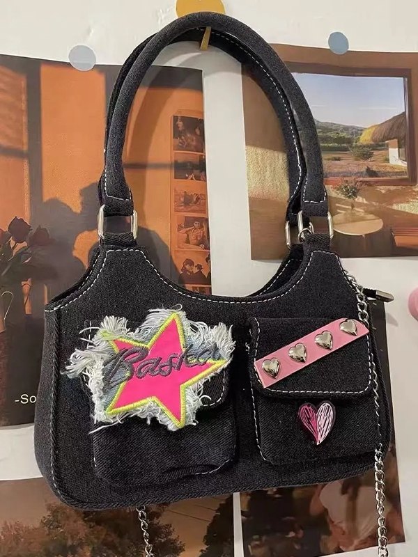 Detalles: estos bolsos de hombro para niñas incluyen un estilo de correa de hombro de cadena larga, presenta una estrella de fray desgastada y una letra bordada, paneles con diseño de bolsillos en la parte delantera, tiene detalles de costura en contraste y un dije de corazón adornado.