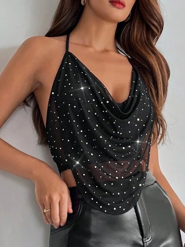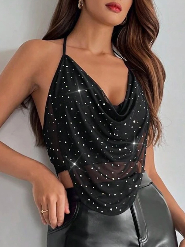Chaleco halter con escote de malla y diamantes de imitación