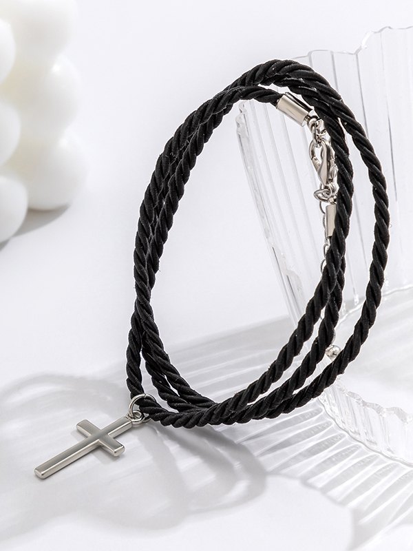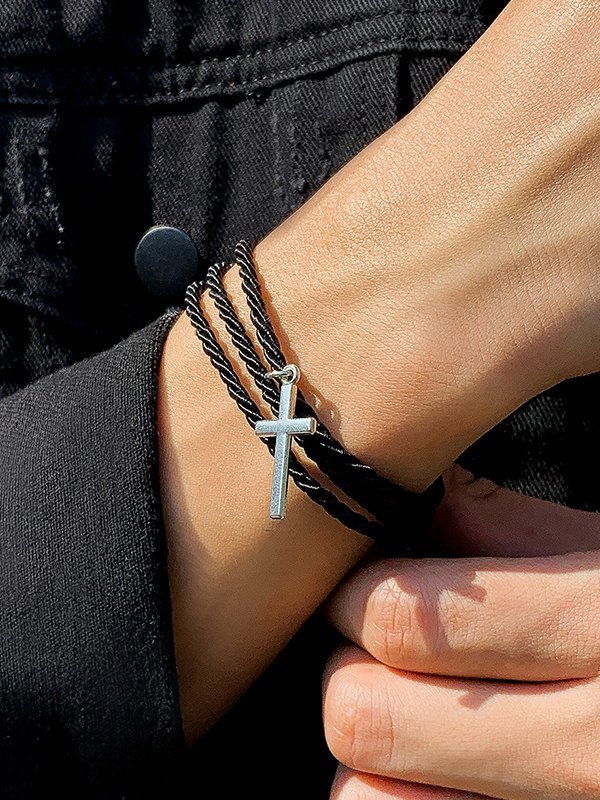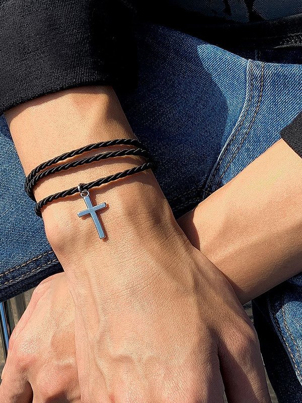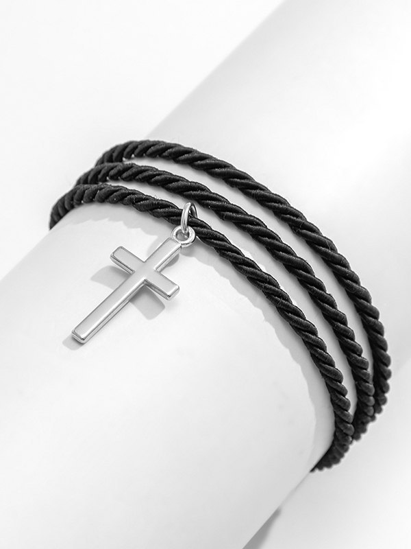 Pulsera de cuerda en capas con colgante de cruz para hombre